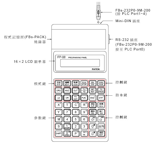 指令鍵: 用以輸入FBs-PLC的各種指令的按鍵。FP-08 鍵盤(pán)上的黑色鍵的最上面兩行, 和第4 的 、 兩鍵均為指令鍵。