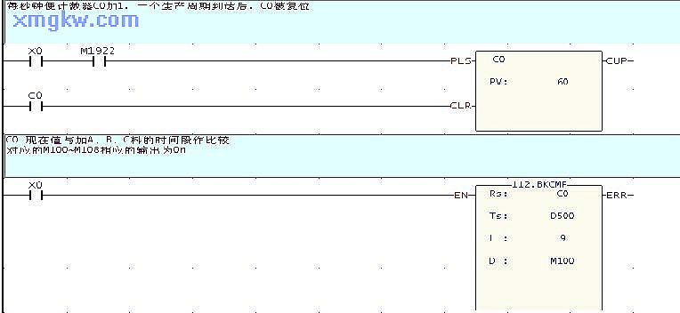 ? 所謂絕對凸輪控制,是指計數(shù)器 C現(xiàn)在值在設置的一段絕對時間段內(nèi),對應輸出裝置會 ON,多個 M 裝置可能同時為 ON。本例中, C0現(xiàn)在值與 9段設置絕對時間段( D500~D517)進行比較,在這些設置時間段內(nèi),對應的 M100~M108 中的裝置狀態(tài)輸出為 ON。 z在BKCMP指令被執(zhí)行前,也可用 MOV指令預先將各設置值寫入到 D500~D517中。| C0當前值所屬范圍 | 輸出裝置 |