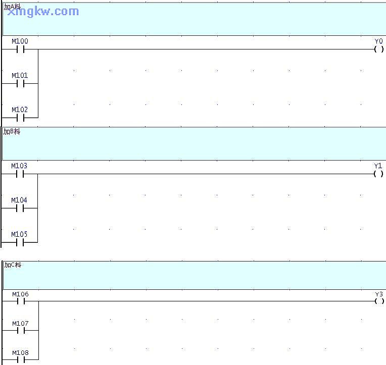 【控制要求】生產(chǎn)某種產(chǎn)品需 A、B、C三種原料, 1個生產(chǎn)周期為 60秒,這些原料需在生產(chǎn)周期適當時間段加入。要求在生產(chǎn)周期的 10秒~20秒,30~40秒,50秒~55秒期間加入 A原料;在生產(chǎn)周期的 0秒~10秒,20~25秒, 40秒~50秒期間加入 B原料;在生產(chǎn)周期的 20秒~25秒,30~35秒,40秒~45秒期間加入 C原料。