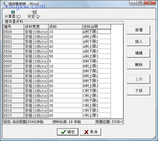 【控制程序】首先將各種原料加入的下限、上限時間設定在緩存器表格中,如下圖: