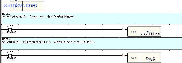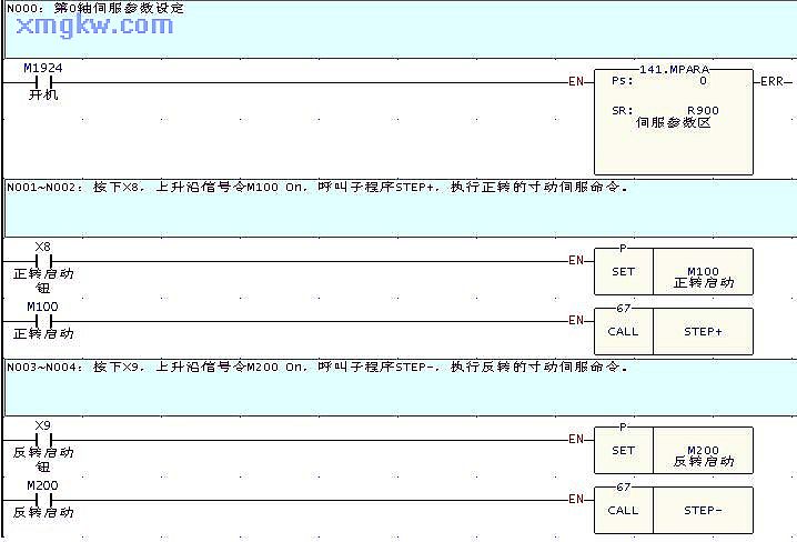 在自動(dòng)倉儲(chǔ)系統(tǒng)或者高樓電梯控制的應(yīng)用中,常有伺服寸動(dòng)的動(dòng)作要求。我們將伺服寸動(dòng)寫成子程序,方便調(diào)用。例如正轉(zhuǎn)的副程式為 STEP+,反轉(zhuǎn)為 STEP-。