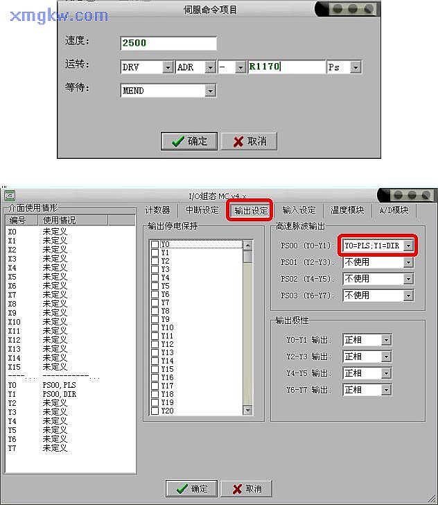 z開機(jī)脈沖M1924 ON,執(zhí)行 FUN141.MPARA設(shè)定伺服參數(shù)。z按X8,令M100 ON,調(diào)用子程序 STEP+,令伺服馬達(dá)正轉(zhuǎn) DR1070的脈沖數(shù)。