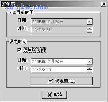 (2)時(shí)間的設(shè)定,也可以在 WinProladder界面中方便實(shí)現(xiàn):點(diǎn)選菜單“PLC”?“設(shè)定”?“萬年歷”,即可出現(xiàn)下列窗口: