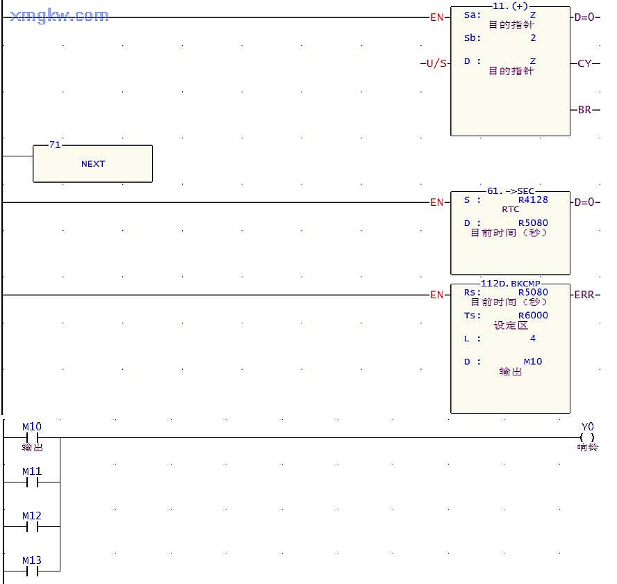 (3)將每次響鈴的上下限時(shí)刻轉(zhuǎn)換為秒,再結(jié)合 FUN112.BKCMP指令,即可實(shí)現(xiàn)一分鐘內(nèi)響鈴。