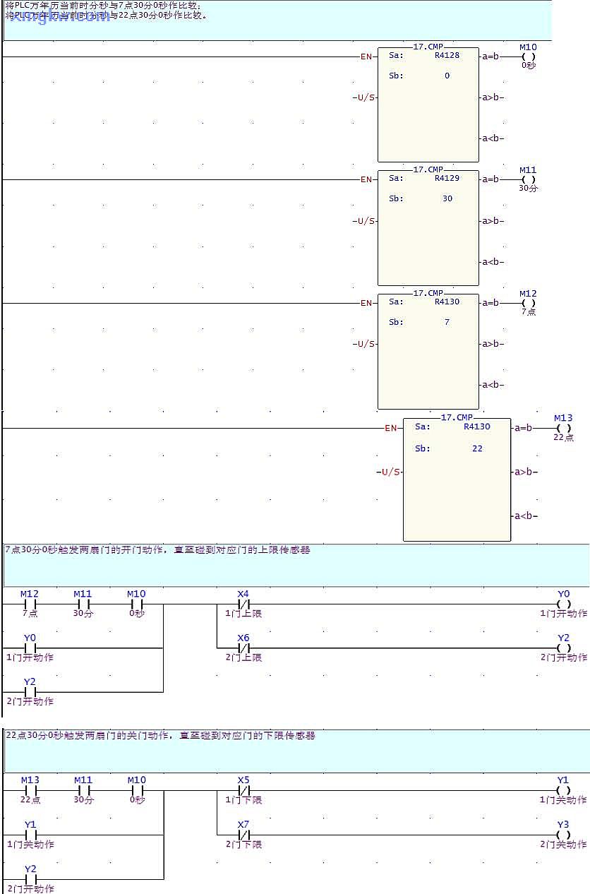 PLC萬年歷當(dāng)前時(shí)間與設(shè)定時(shí)間,實(shí)現(xiàn)倉庫門自動(dòng)控制功能。其中程序行 N000~N003為比較指令,若把設(shè)定值存放在緩存器中,結(jié)合人機(jī)界面,即可隨意把任意時(shí)間值(精確到秒)設(shè)定為倉庫門開閉時(shí)刻。