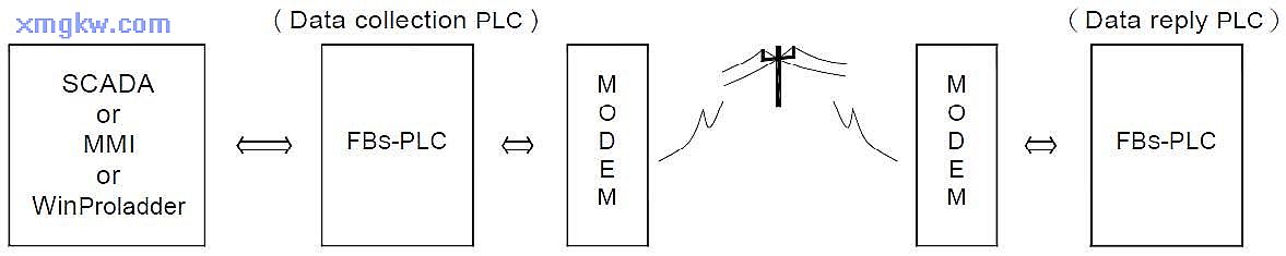 PLC 可經(jīng)由通訊端口 1 接MODEM通過電信網(wǎng)絡與遠程的 PLC 聯(lián)機共享數(shù)據(jù),應用如下: