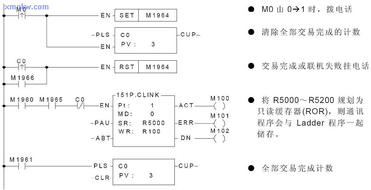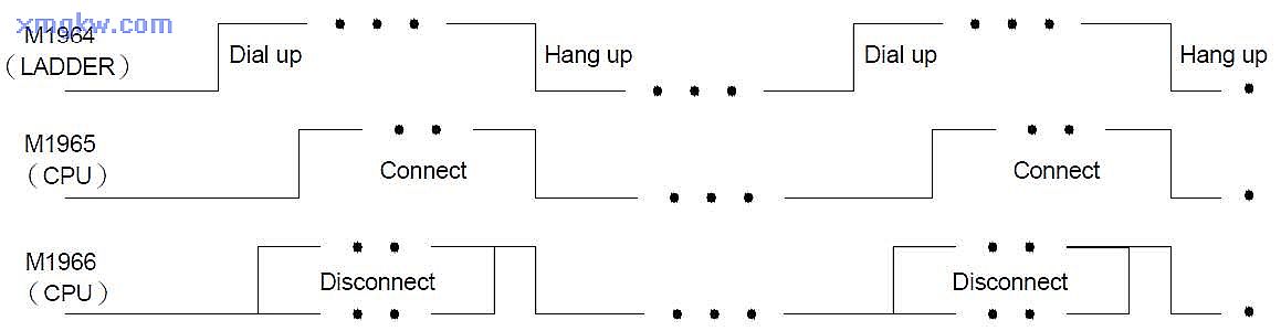【MODEM 撥號接口信號】 M1959:OFF,撥號方式為〝 Tone〞;ON,撥號方式為〝 Pulse〞。 M1964:OFF→ON,撥號。 ON→OFF,掛電話。R4163:R4163的低字節(jié) (Low Byte)用來控制 MODEM撥號時 X指令的應用