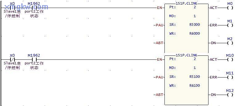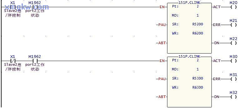 1. X0,X1兩個(gè)開關(guān)的 ON/OFF狀態(tài)分別對(duì)應(yīng)兩臺(tái) slave PLC的run/stop,因此在程序中用這四個(gè)狀態(tài)啟動(dòng) 4個(gè) CLINK指令,發(fā)送通訊命令,即可達(dá)到控制要求。