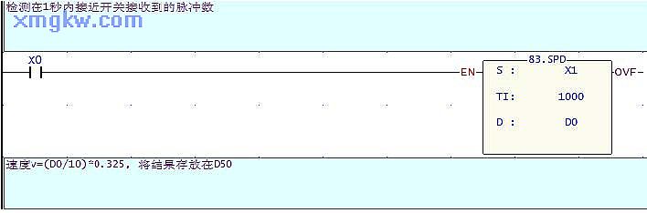 SPD 指令測得的接近開關的脈沖頻率( D0)來計算出電機的轉(zhuǎn)速。電機轉(zhuǎn)速 (r/min)=每分鐘內(nèi)測得的脈沖數(shù)目 /10=(脈沖頻率 ×60)/10=(D0×60)/10。