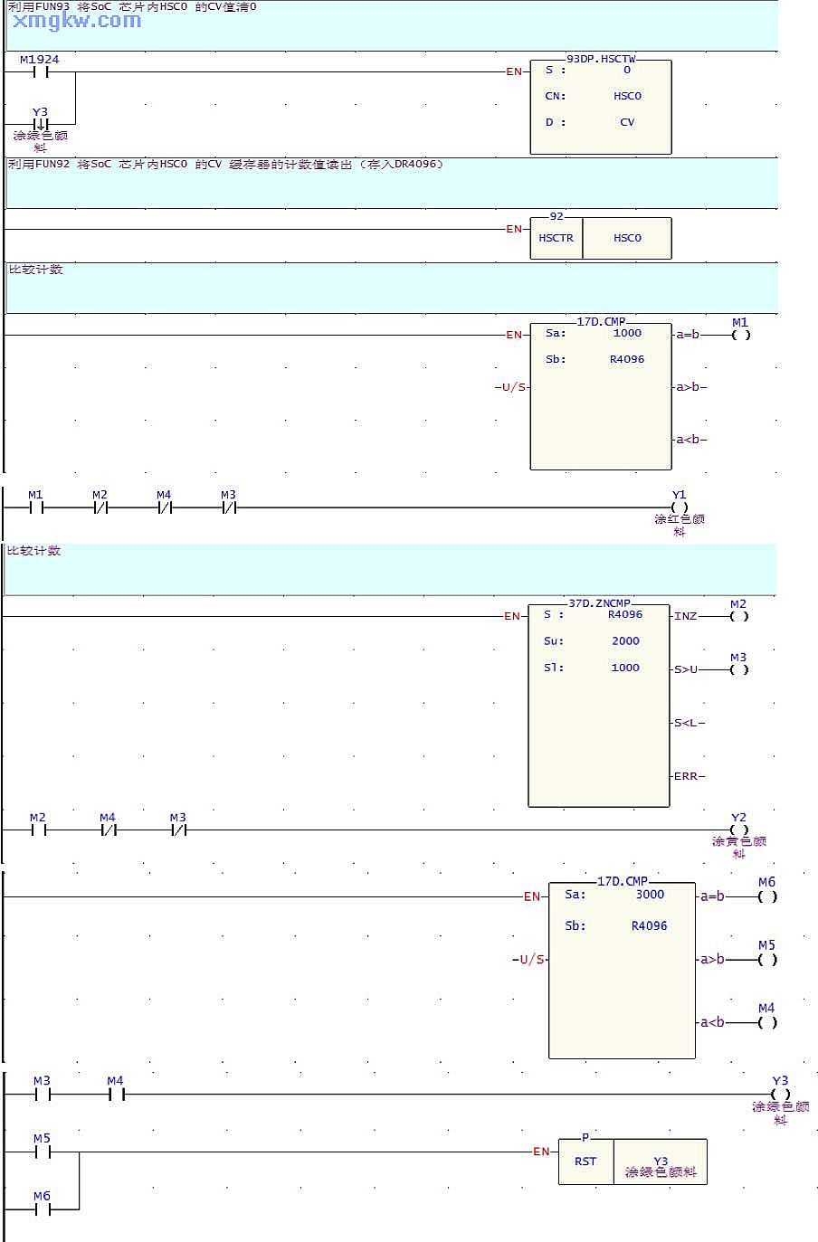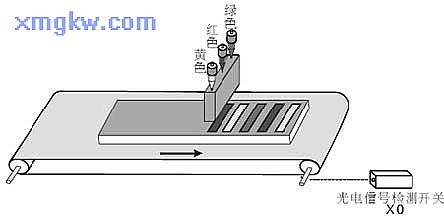 【控制要求】用紅、黃、綠三種顏料對傳送帶上的產(chǎn)品進行涂料操作。傳送帶滾軸每轉(zhuǎn)動 1000圈,換一種噴涂顏料,三種顏料循環(huán)使用。例如:紅、黃、綠、紅、黃、綠、紅 ……