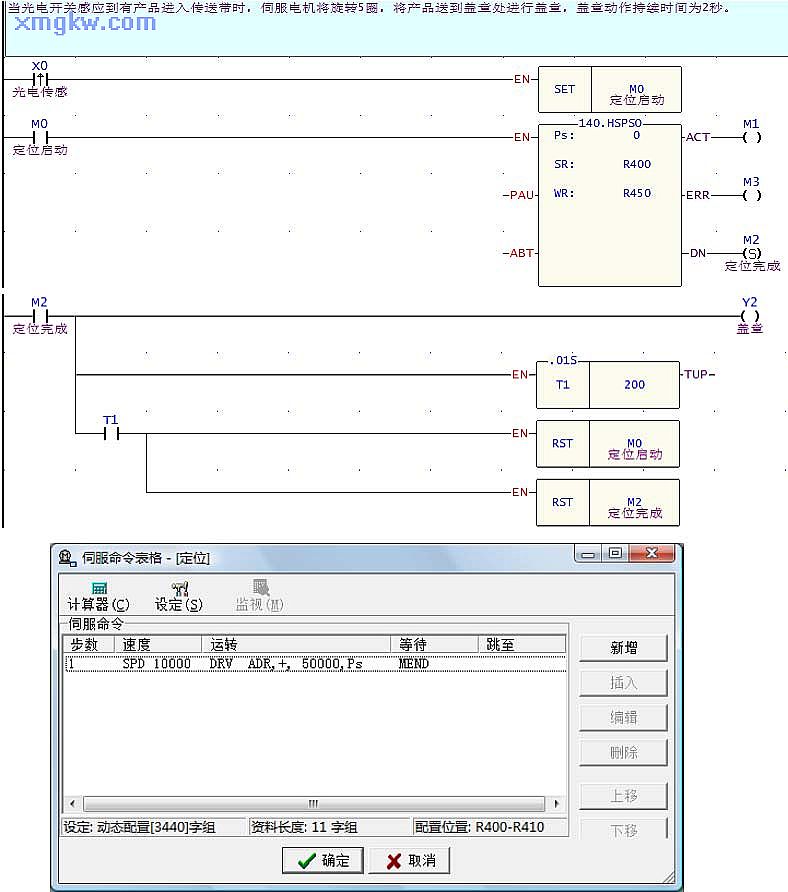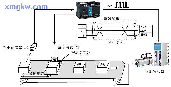 【控制要求】當(dāng)光電開關(guān)感應(yīng)到有產(chǎn)品進(jìn)入傳送帶上時(shí),伺服電機(jī)將旋轉(zhuǎn) 5圈,將將產(chǎn)品送到蓋章處進(jìn)行蓋章,蓋章動(dòng)作持續(xù)時(shí)間為 2秒。