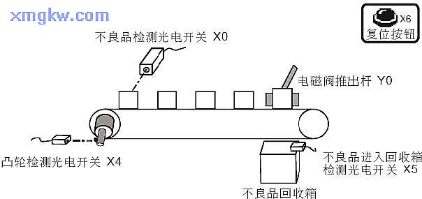 【控制要求】產(chǎn)品被傳送至傳送帶上作檢測,當光電開關(guān)檢測到有不良品時(高度偏高),在第 5個定點將不良品通過電磁閥排出,排出到回收箱后電磁閥自動復位。當在傳送帶上的不良品記憶錯亂時,可按下復位按鈕將記憶數(shù)據(jù)清零,系統(tǒng)重新開始該檢測。
