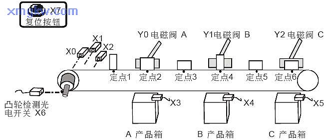 產(chǎn)品進(jìn)入傳送帶前自動(dòng)通過(guò)三個(gè)識(shí)別傳感器檢測(cè)出產(chǎn)品類(lèi)型,A類(lèi)型產(chǎn)品將在定點(diǎn) 2通過(guò)電磁閥送到 A產(chǎn)品箱, B類(lèi)型產(chǎn)品將在定點(diǎn) 4被送到 B產(chǎn)品箱, C類(lèi)型產(chǎn)品將在定點(diǎn) 6 被送到 C產(chǎn)品箱。