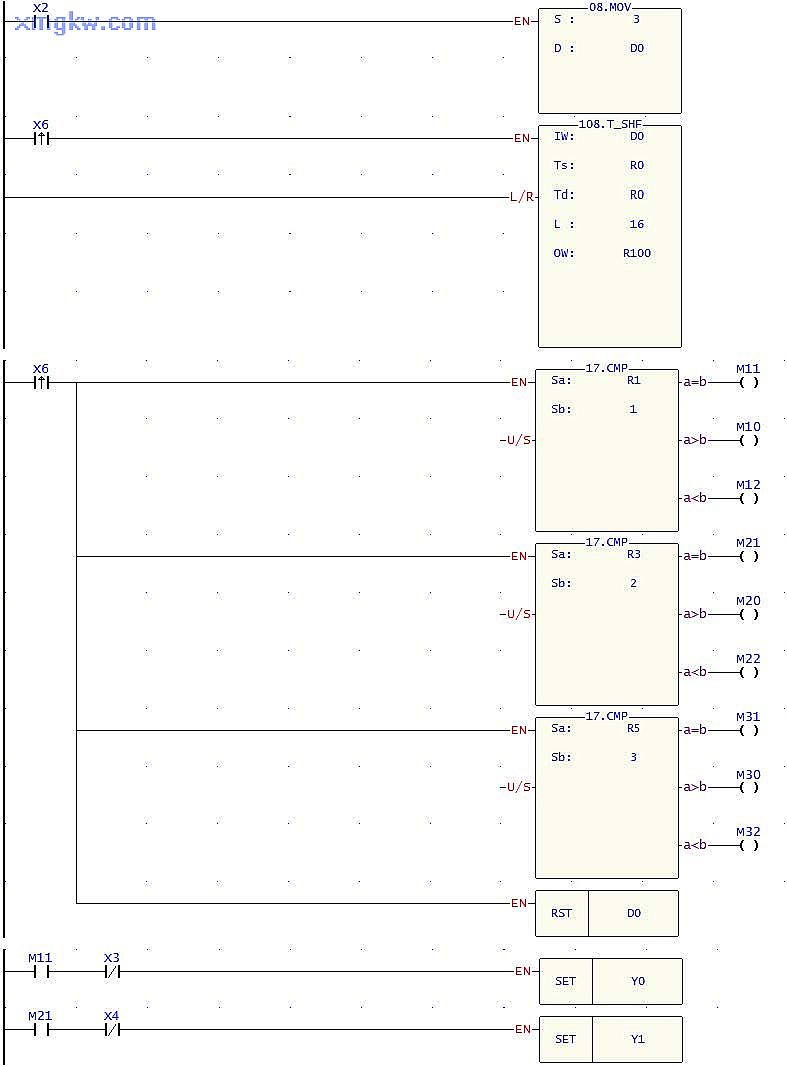 當(dāng)凸輪旋轉(zhuǎn)一圈,傳送帶上的物品從一個(gè)定點(diǎn)移到另一個(gè)定點(diǎn), X6由OFF→ON變化一次, T-SHF指令執(zhí)行,R0-R15的內(nèi)容往左移位一個(gè)寄存器;同時(shí), CMP指令執(zhí)行,在定點(diǎn) 2(R1)判斷是否為 A產(chǎn)品、在定點(diǎn) 4(R3)判斷是否為 B產(chǎn)品、在定點(diǎn) 6(R5)判斷是否為 C產(chǎn)品,每次比較完成后, RST指令被執(zhí)行, D0被復(fù)位。