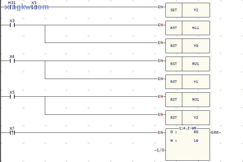 當(dāng)已確認(rèn)將產(chǎn)品推到產(chǎn)品箱時(shí), X3,X4,X5 將為ON,此時(shí), RST 指令執(zhí)行,對(duì)應(yīng)的 A,B,C 電磁閥將被復(fù)位。