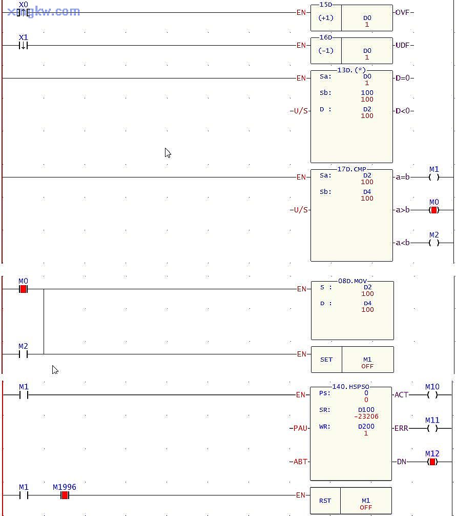 作為絕對定位的目標位置值,同時 M1被置位為 On,F(xiàn)un.140指令執(zhí)行,系統(tǒng)從上次位置( D4=100)跑到目標位置( D4=D2=200),再次左移 1mm。依此類推,右移的情況與此相似,只要有按下右移寸動開關(guān)一次,將右移 1mm。