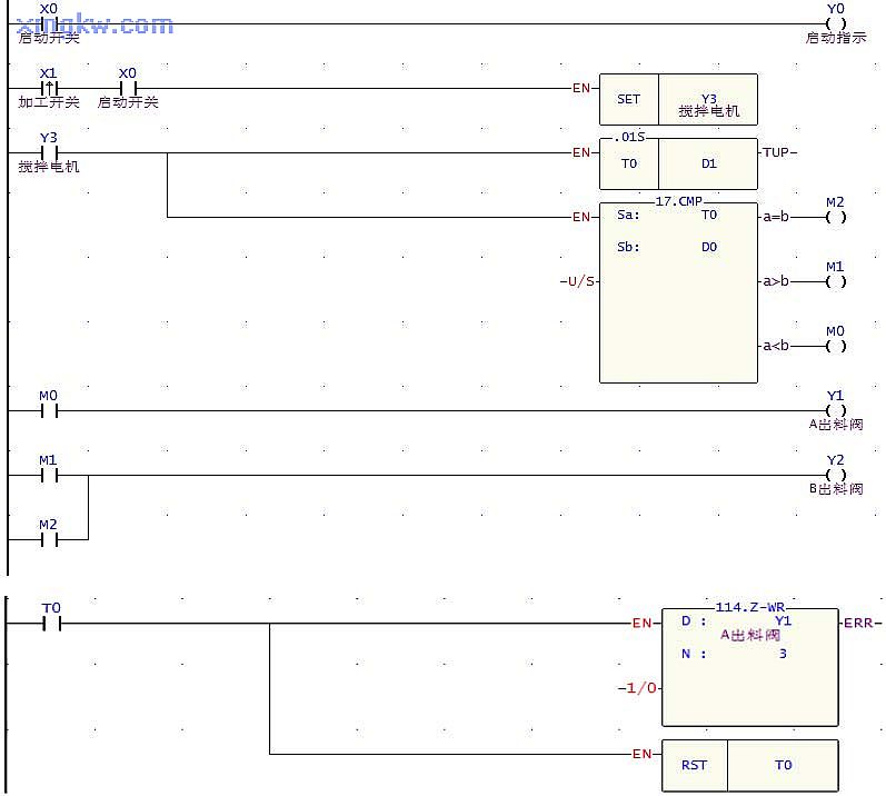 當按下加工按鈕后, X1由 OFF→ON變化, SET指令被執(zhí)行,且 Y3被置位,則攪拌電機不停轉(zhuǎn)動,而且 T0開始計時。