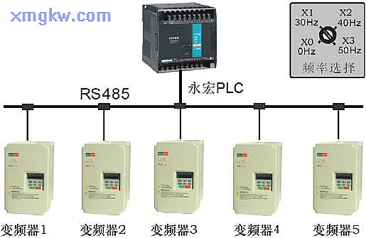 【控制要求】用一臺 FBs-24MC PLC主機通過 RS485通訊,控制多臺變頻器時,有時需要多臺變頻器的運轉(zhuǎn)頻率相同。假設(shè)通過 PLC內(nèi)部程序使得 PLC的 D10~D14分別對應(yīng) 5臺變頻器的驅(qū)動頻率。這時,只需旋動多段旋鈕開關(guān),即可同時改變 5臺變頻器的頻率。