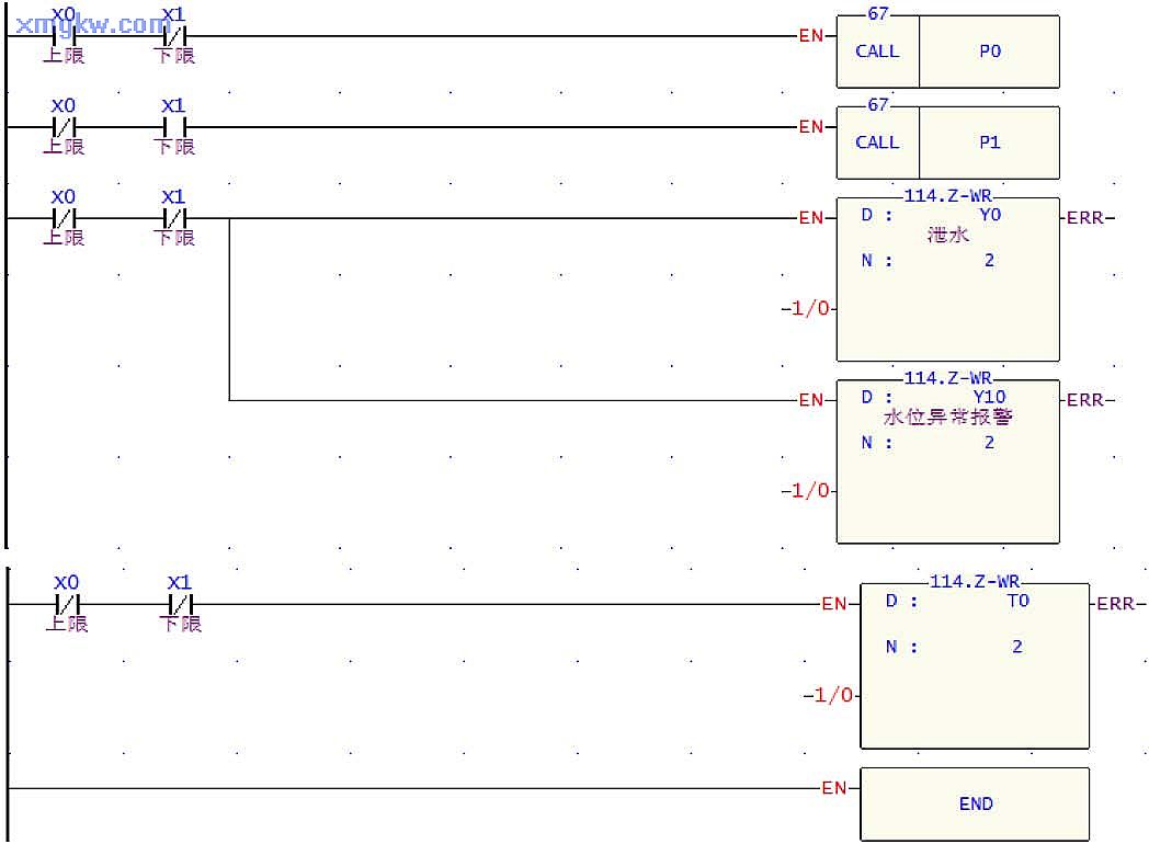 當(dāng)水位超過(guò)上限時(shí), X0=ON,CALL P0指令被執(zhí)行,執(zhí)行子程序 P0,線圈 Y0和Y10都為ON,進(jìn)行泄水動(dòng)作并且水位異常報(bào)警燈報(bào)警,直到 X0變?yōu)镺FF,即水位低于上限水位時(shí),才停止執(zhí)行子程序 P0。