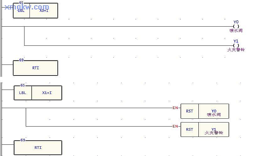 當(dāng)警報(bào)解除時(shí),按下警報(bào)解除按鈕, X1由OFF→ON變化,PLC 立即停止主程序執(zhí)行,轉(zhuǎn)而執(zhí)行中斷子程序“X1+I”,關(guān)閉噴水閥( Y0)和警鈴( Y1);“ X1+I”執(zhí)行完畢后,再返回主程序從斷點(diǎn)處繼續(xù)往下執(zhí)行。