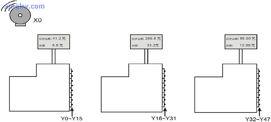 X0=OFF,F(xiàn)OR~NEXT循環(huán)執(zhí)行3次,H0被依次送到 R0~R2中,F(xiàn)OR~NEXT循環(huán)執(zhí)行完畢后,R0~R2的值被送到外部 Y輸出點(diǎn),所有 Y輸出被復(fù)位為 OFF,每個(gè)錢(qián)柜抽屜可以打開(kāi)。