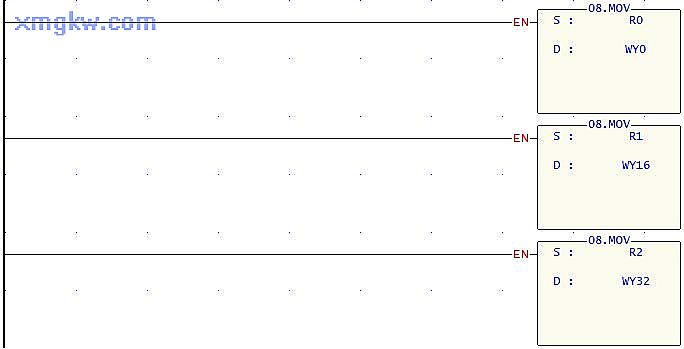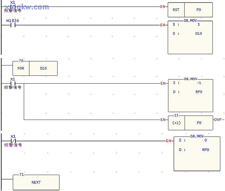 2. P0=0時(shí),RP0代表R0;P0=1時(shí),RP0代表R1;P0=2時(shí),RP0代表R2。當(dāng)警報(bào)響時(shí), X0=ON,F(xiàn)OR~NEXT循環(huán)執(zhí)行3次,F(xiàn)FFFH被依次送到 R0~R2中,F(xiàn)OR~NEXT循環(huán)執(zhí)行完畢后, R0~R2的值被送到外部 Y輸出點(diǎn),所有 Y輸出被置位為 ON,將每個(gè)錢(qián)柜抽屜鎖住。