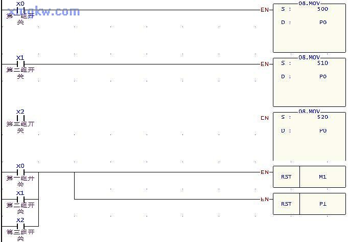 當選擇其中一組配方參數(shù)時, X0、X1、X2其中一個將變?yōu)?ON,P0的值將分別對應(yīng)為 500、510、520, DP0將分別代表 D500、D510、D520,同時 [RST M1]指令執(zhí)行, M1復(fù)位變?yōu)镺FF,RST P1指令和 FOR~NEXT循環(huán)將被執(zhí)行,因 P1被復(fù)位變?yōu)?0,DP1代表D0。