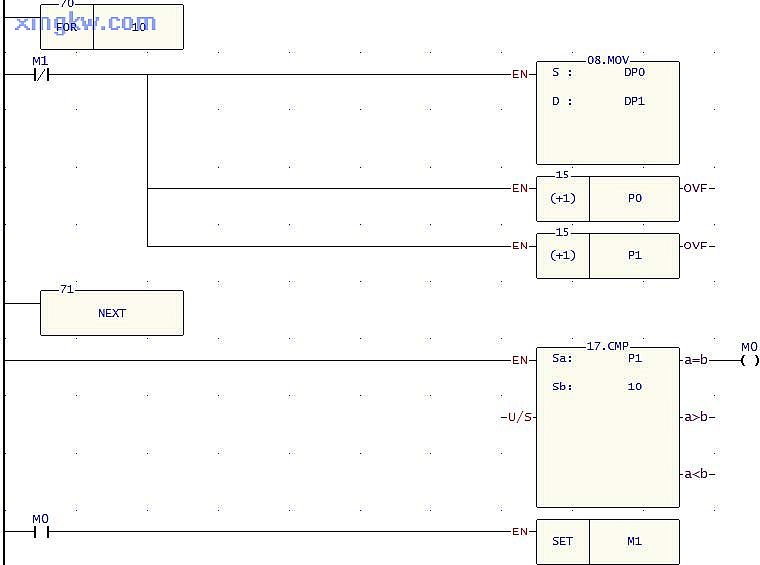 當循環(huán)次數(shù)到達時,即 P1=10,[SET M1]指令將被執(zhí)行, M1被置位變?yōu)?ON,F(xiàn)OR~NEXT循環(huán)中的指令因M1的常閉接點斷開而停止執(zhí)行。