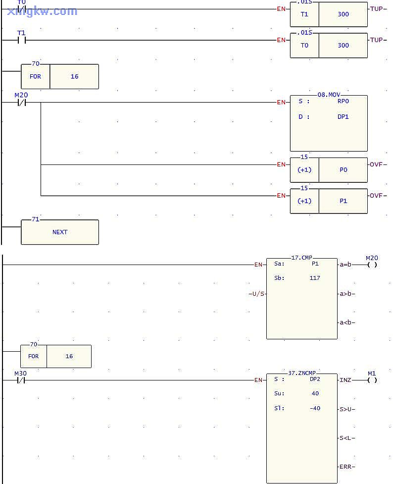 【控制要求】 FBS-40MA + FBs-TC16,偵測外部 16路溫度 , 每隔3秒將新溫度數(shù)據(jù)放入 D101-D116;當溫度超過 40℃或小于- 40℃時,正常指示燈滅。