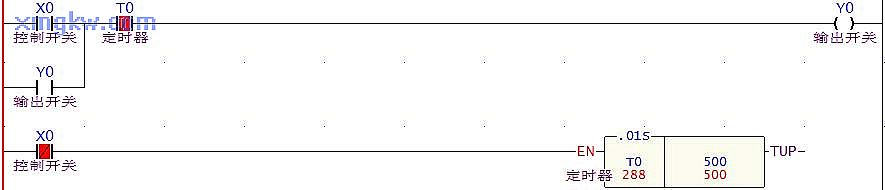 當開關(guān) X0接通為 ON時燈 Y0亮,當開關(guān) X0斷開為 OFF時,需再經(jīng)過 5秒鐘后 Y0燈才熄滅?!窘M件說明】