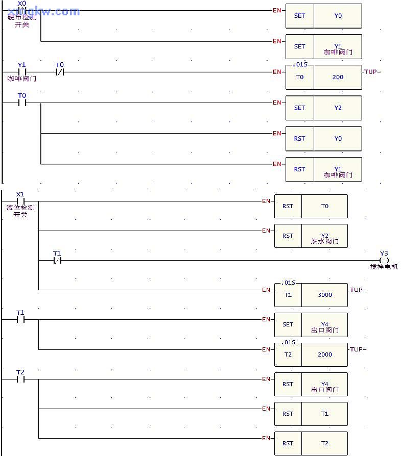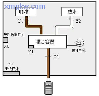 【控制要求】投入一枚硬幣后,出紙杯處彈出一個紙杯,同時出咖啡, 2秒鐘后出熱水,注入到一定量熱水后,攪拌電機運行, 30秒后從咖啡流出口流出沖調(diào)好的咖啡。