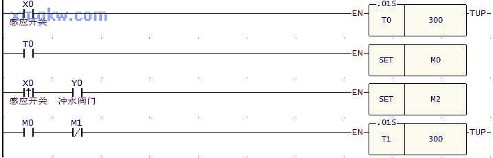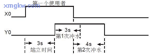 當(dāng)檢測到有人進入時,紅外線傳感器 X0=ON,T0得電開始計時。若在 3秒內(nèi)人離開( X0=OFF), T0失電,不執(zhí)行任何動作。若人站滿 3秒,則 T0的常開接點閉合,保持 M0=ON,開始第一次沖水(Y0=ON)。
