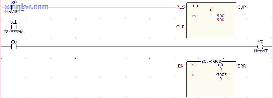 每完成一臺(tái)產(chǎn)品, C0計(jì)數(shù)一次,計(jì)數(shù)到 500次,Y0=ON,目標(biāo)完成指示燈亮。