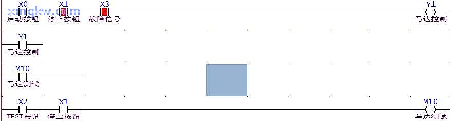 X1=ON,按下 TEST按鈕, X2=ON,此時(shí)在馬達(dá)無(wú)故障( X3=OFF)的情況下, Y1=ON,馬達(dá)運(yùn)轉(zhuǎn);松開(kāi) TEST按鈕,馬達(dá)立即停止運(yùn)行,該測(cè)試可檢測(cè)馬達(dá)是否正常。