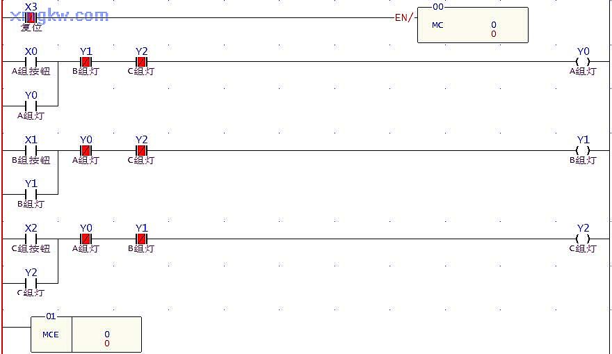 主持人未按下按鈕時, X3信號狀態(tài)為 OFF,那么 X3常閉觸點 =ON,則[MC 0]指令不執(zhí)行,所以 MC0~MCE0之間程序正常執(zhí)行。