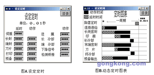 系統(tǒng)在程序設(shè)計中采用周期時間控制,對執(zhí)行機(jī)構(gòu)輸出設(shè)定延時時間和動作時間,如下圖A所示,并設(shè)定動態(tài)圖直接反映周期內(nèi)的延時和動作時間,設(shè)置超出范圍或者錯誤將在動態(tài)圖中直接看出,如下圖B所示,控制直觀,易于實現(xiàn),減少了產(chǎn)品種類不同要求的調(diào)試時間.