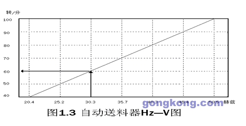 自動供料器按照設(shè)定轉(zhuǎn)速來決定其生產(chǎn)袋數(shù).其轉(zhuǎn)速則由變頻器編程控制設(shè)定的赫茲數(shù)來決定,對應(yīng)的赫茲-轉(zhuǎn)速如圖1.3所示.當(dāng)設(shè)定30.3Hz時,則自動送料器以60轉(zhuǎn)/分的速度旋轉(zhuǎn).