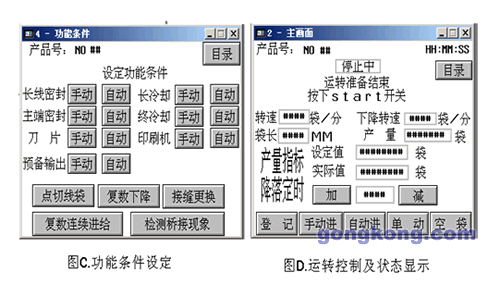 本程序考慮到系統(tǒng)功能全面性,設(shè)定了如下圖C所示的功能條件設(shè)定畫面,滿足了產(chǎn)品多樣性要求; 而下圖D所示的運轉(zhuǎn)控制及狀態(tài)顯示界面很好地達(dá)到了系統(tǒng)作業(yè)要求.