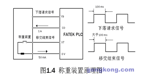 稱重裝置又稱連鎖信號裝置,用于與機(jī)器相連,其結(jié)構(gòu)原理如圖1.4所示.其中裝入信號(下落請求信號)為可變脈沖寬度(一般100 ms),下落信號(移交結(jié)束信號)為設(shè)定脈沖寬度大于100 ms信號.
