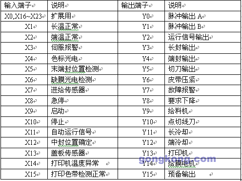 系統(tǒng)關(guān)鍵的控制器PLC選用的是臺灣永宏電機(jī)股份公司的FATEK MA系列FBs-40MAT機(jī)型,永宏第四代小型機(jī)FBs系列是一種有很高性能和價格比的可編程控制器,由于其結(jié)構(gòu)緊湊小巧,執(zhí)行速度快,功能強(qiáng)大及價格 低廉等特點,符合本系統(tǒng)各方面要求.在該系統(tǒng)中,永宏表格式的伺服控制編程方式簡而易己地實現(xiàn)了伺服控制,其高速脈沖直接驅(qū)動伺服電機(jī).I/O點分配如 下: